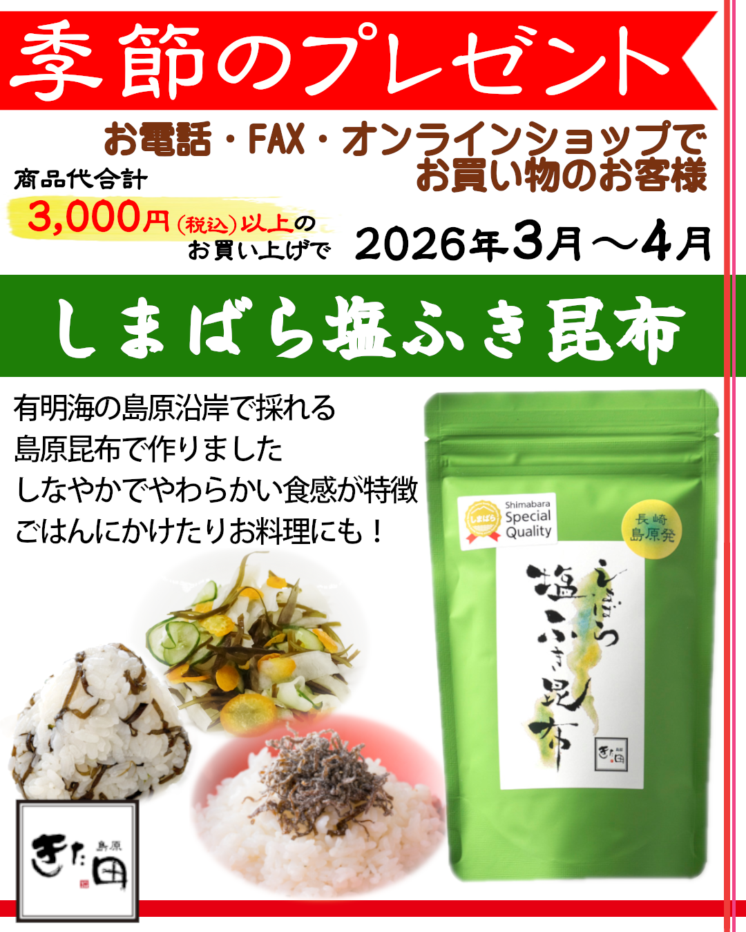 タグ:FAX注文 / しまばら塩ふき昆布 / オンラインショップ / プレゼント / 北田物産 / 地方発送 / 季節のプレゼント / 島原きた田 / 島原市 / 特典 / 買い物特典 / 長崎・島原 / 電話注文